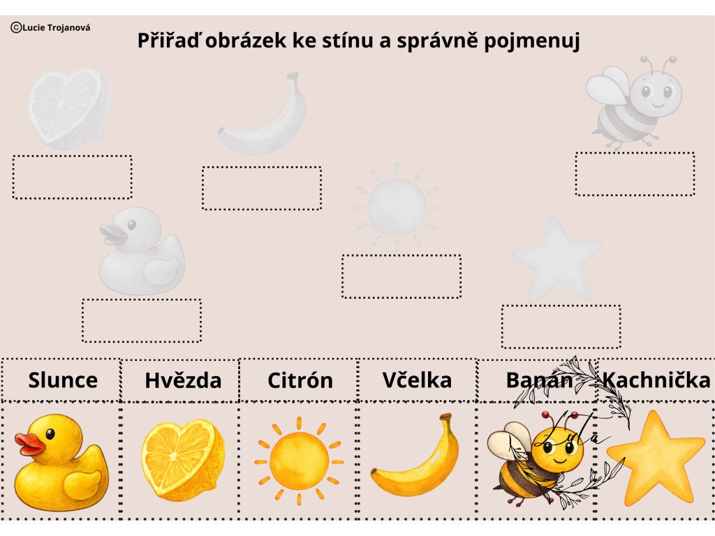 Stínové hry (9 stran): Přiřazování barevných obrázků k jejich černobílým stínům (trénink zrakového vnímání).