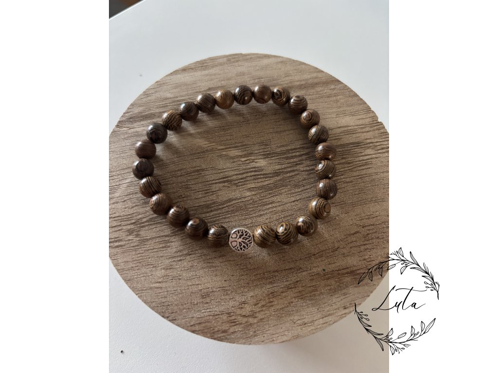 Náramek z dřevěných korálků a bižutérního komponentu. Náramek je vytvořený o průměru 20cm.