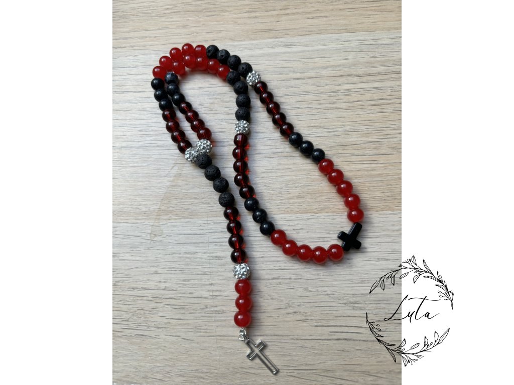 Krásný růženec pro štěstí v délce 30cm. Černo červený z černých lávových kamenů, s umělým praskaným křišťálem, ametystem a umělými zirkony.